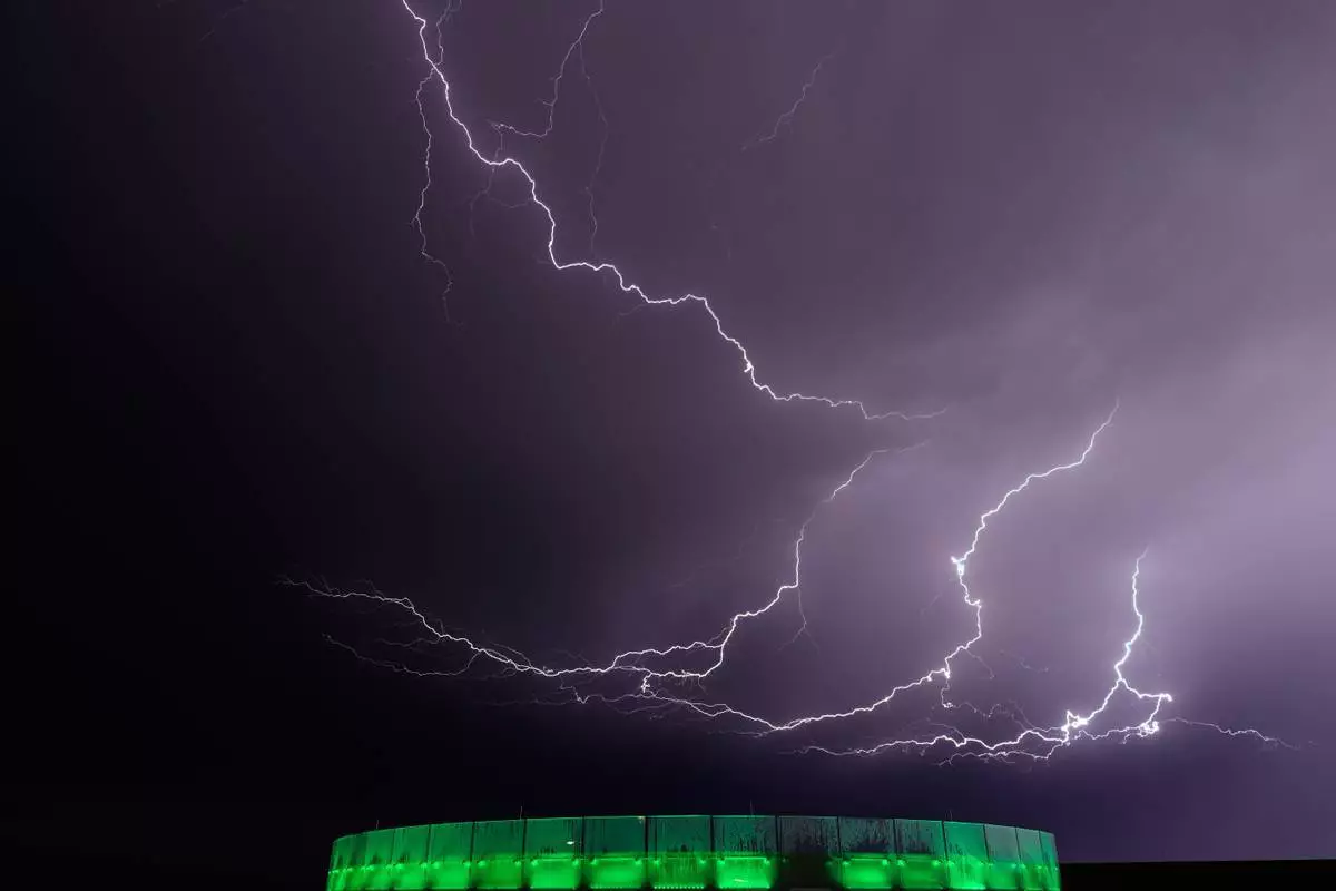 2026年4月13日周一,堪薩斯州萊內克薩(Lenexa, Kan.),遠處雷暴經過時,閃電在辦公大樓後方閃爍。(美聯社圖片/Charlie Riedel) AP圖片