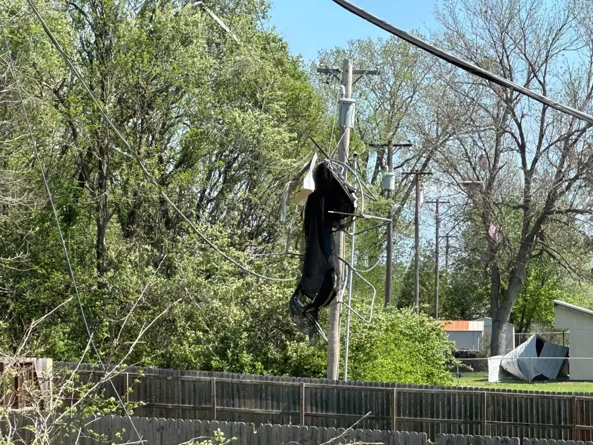 周二(2026年4月14日),堪薩斯州渥太華,惡劣風暴吹襲後,一個彈床纏繞在房屋後的電線上。(美聯社圖片/Nick Ingram) AP圖片
