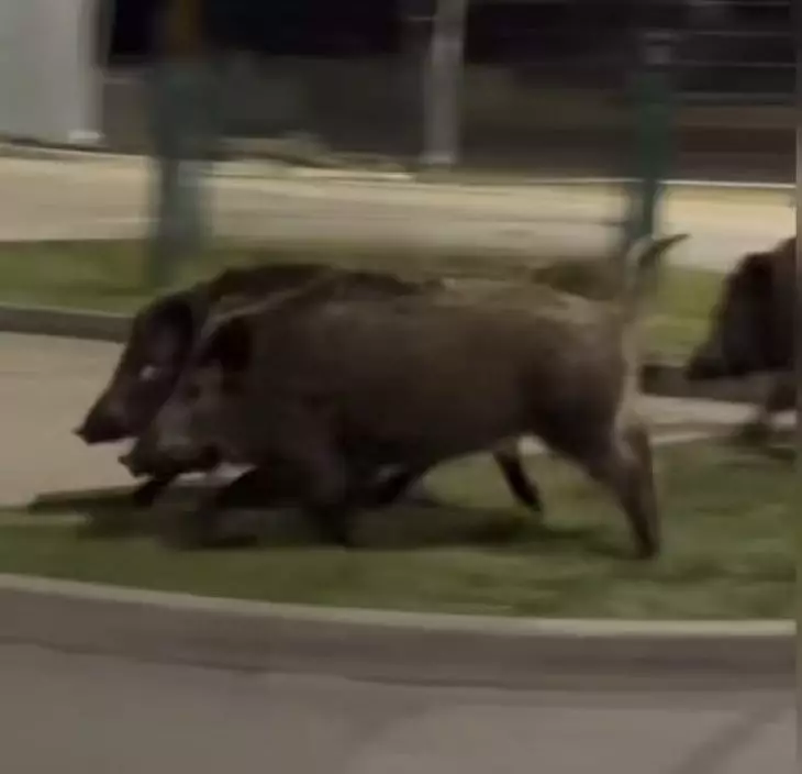 波蘭街頭上演一幕「機械人大戰野豬」的罕見場面,3頭野豬嚇到倉皇逃入漆黑樹林中。