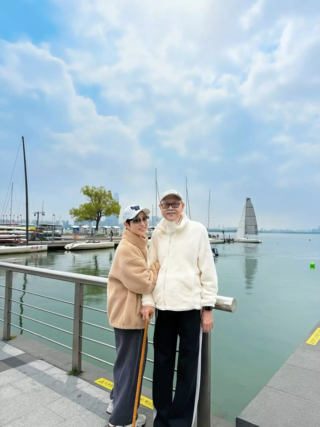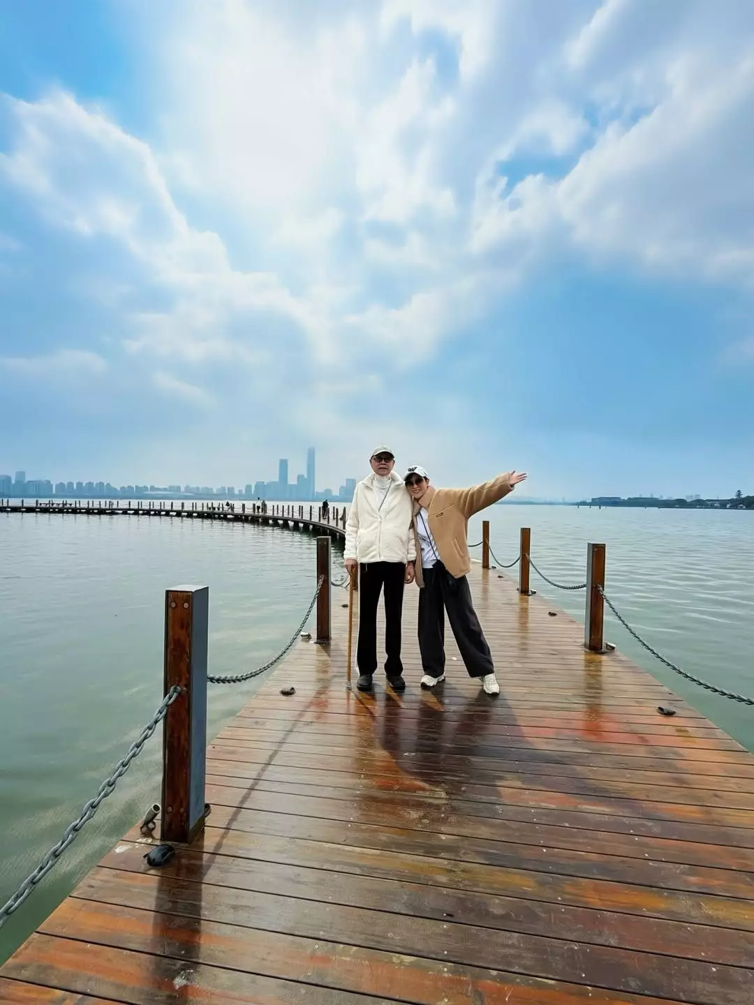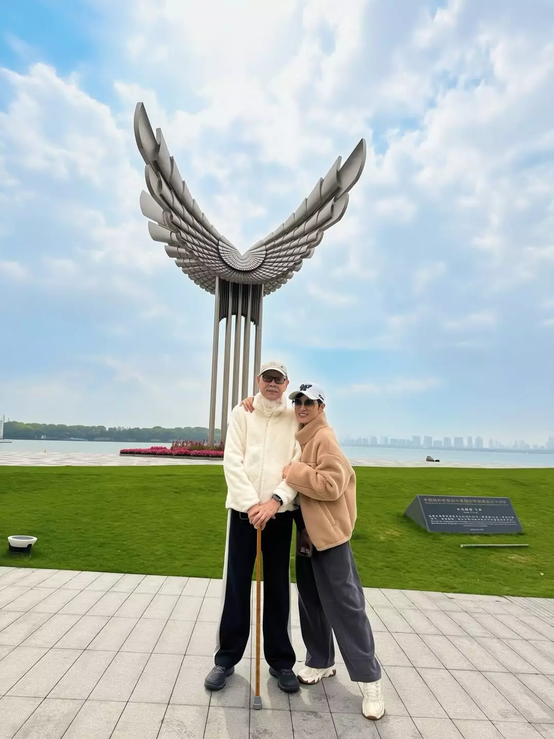 相中可見,陳法蓉與爸爸以「父女裝」上陣,齊齊戴上白色cap帽和黑超,並穿上款式相近的珊瑚絨外套,相當有心思。一血陳爸爸雖然出入需要撐拐杖,但他全程笑容燦爛,精神相當不俗。陳法蓉表示:「帶爸爸來蘇州,去了金雞湖、李公堤,湖邊慢慢走,風吹着很舒服。爸爸看着遠處的東方之門笑着說:『這個樓真有意思,好像一條褲。』我們坐在湖邊喝咖啡,他忽然說:『小時候我帶你逛公園,現在換你帶我逛了。』晚上回去路上,他輕聲說:『今天很開心。』我也是,爸爸。#陪伴是最長情的告白 #金雞湖# #和爸爸的日常 和爸爸在一起去旅行~」