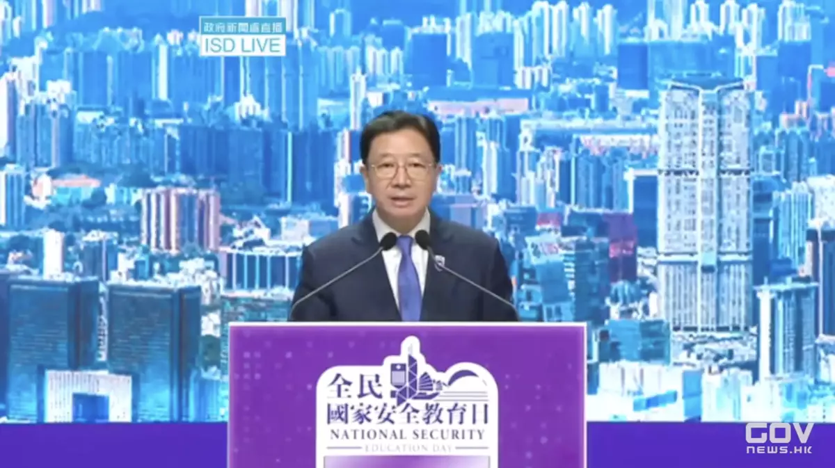 中央人民政府駐香港特別行政區聯絡辦公室主任、香港特區維護國家安全委員會國家安全事務顧問周霽出席「全民國家安全教育日」開幕典禮暨主題講座並致辭。政府新聞網直播視頻截圖