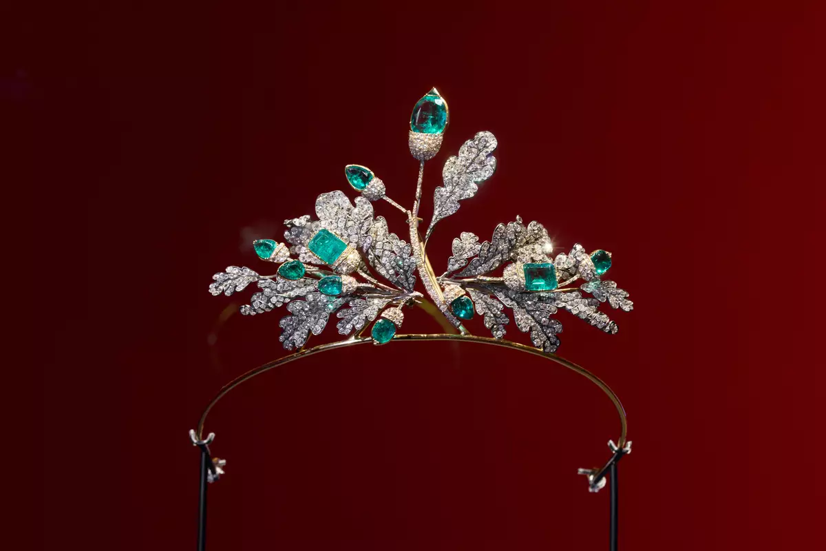 第二單元「王室貴族珠寶——王者之軀」探討王室及宮廷珠寶如何彰顯等級、權力與地位,如千燈室收藏的橡樹葉與橡果冠冕(可轉換為三枚胸針)(約1840–1850年),展廳內設有擴增實境(AR)多媒體裝置,邀請觀眾以虛擬方式試戴橡樹葉與橡果冠冕。