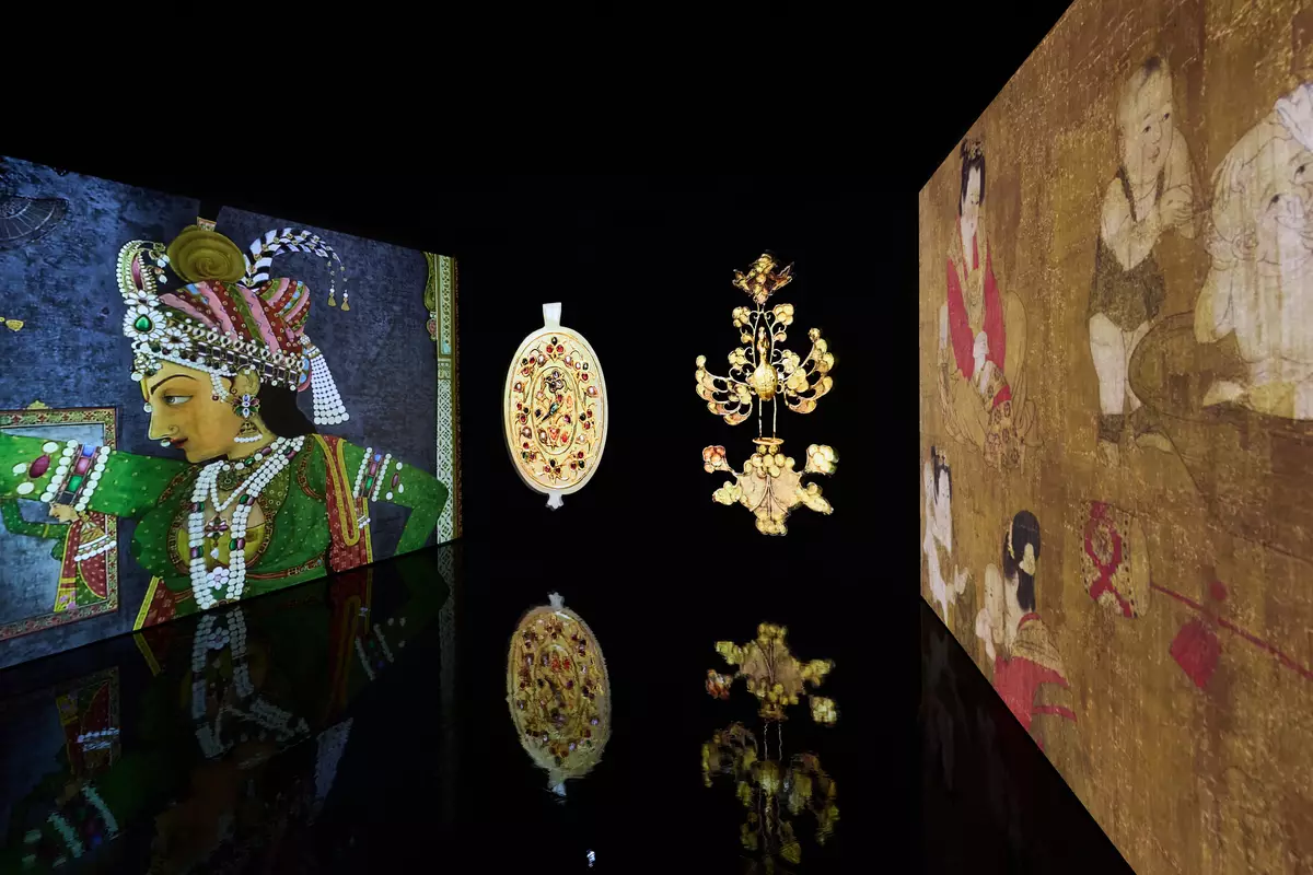 黃金珠寶與金色馬賽克地板,配合鋪貼金色壁紙的牆身。圖片來源:香港故宮文化博物館