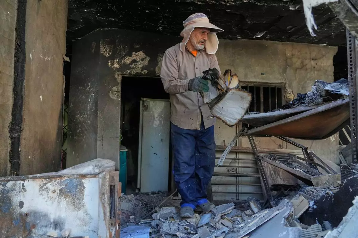 2026年4月14日周二,伊朗德黑蘭東南部,一名志願者在一棟住宅大樓的瓦礫中翻動一本燒焦的書。據當局稱,該大樓於3月4日的美以軍事行動中受損。(美聯社圖片/Vahid Salemi) AP圖片