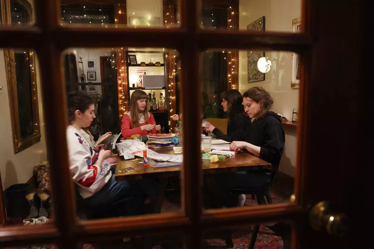 2026年3月25日周三,在紐約布魯克林區(Brooklyn)的活動組織者丹霍士(Dan Fox)家中,賓客們在每周一次的無手機聚會中寫日記和編織。(美聯社圖片/Heather Khalifa) AP圖片