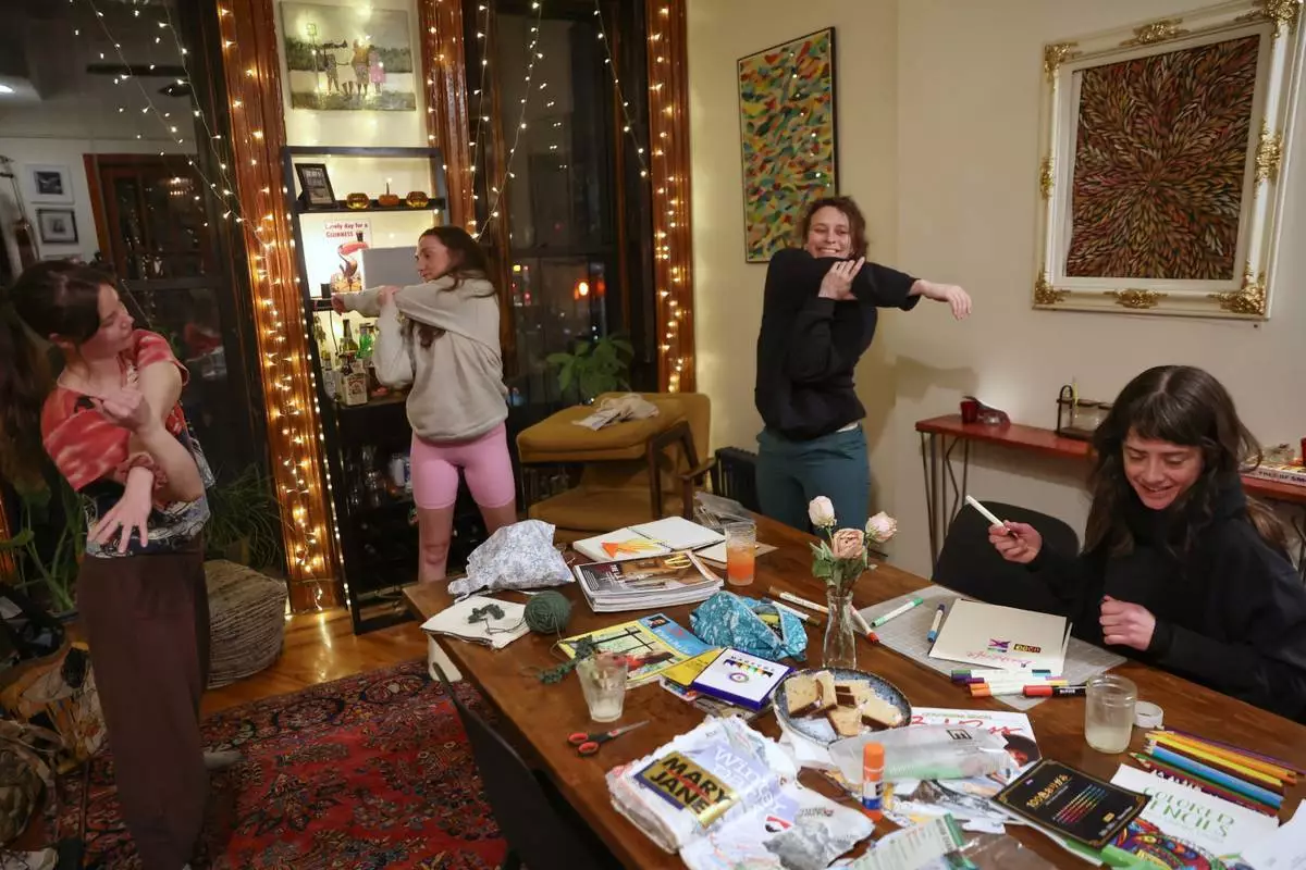 在紐約布魯克林 (Brooklyn) 區,主辦人丹霍士 (Dan Fox) 家中舉行每周無手機聚會,賓客們玩著90年代的摺紙遊戲。攝於2026年3月25日周三。(美聯社圖片/Heather Khalifa) AP圖片