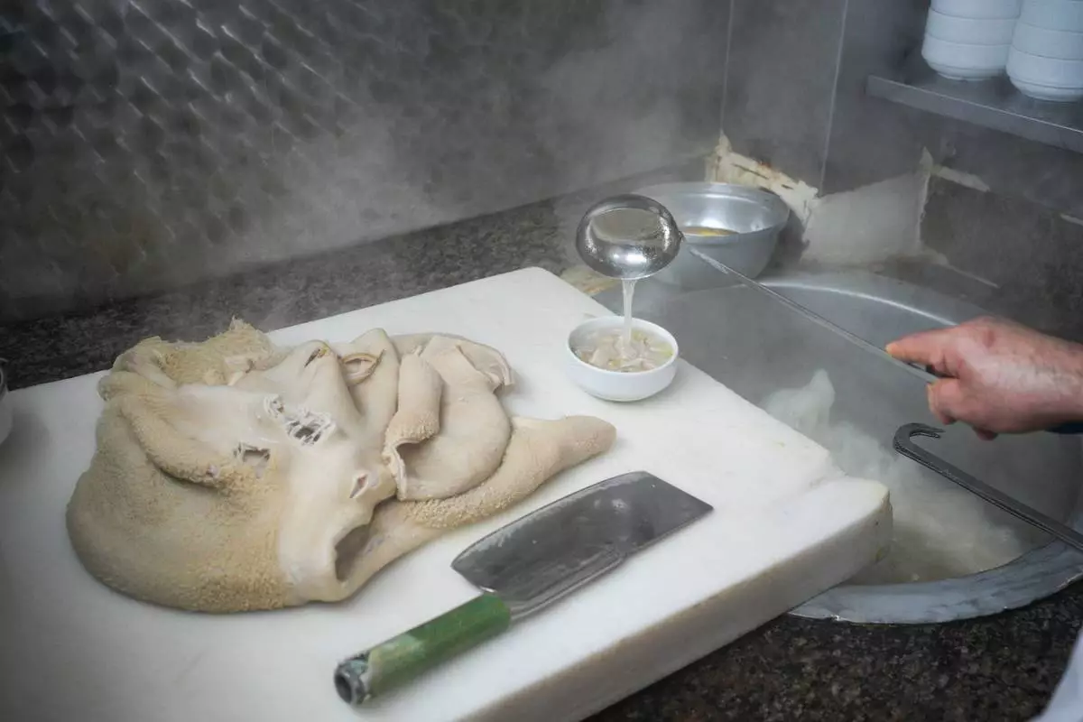 在餐廳廚房內,湯品的準備過程幾乎是儀式性的。廚師潘塔齊斯·庫庫姆夫里斯(Pantazis Koukoumvris)在沸騰的大鍋前揮舞著刀,牛腿和牛肚在湯汁中燉煮。