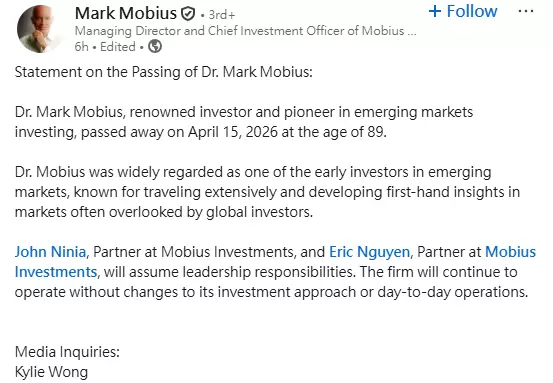 有「新興市場教父」之稱的麥樸思(Mark Mobius)周三(15日)在新加坡去世,享年89歲。