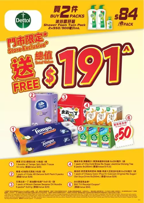 同場加映,惠康亦推出本周堅着數推薦,送出總值高達191元的豐富贈品。如買2件滴露沐浴露孖裝2x950/900毫升,送總值$191贈品;買維他甜茶/果汁/清心棧滿$68,送總值$48.5贈品