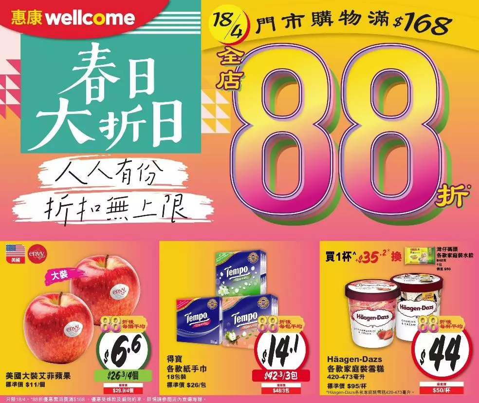 惠康超級市場星期四(4月16日)宣布,全線門市將於今個星期六(4月18日)推出限時一日的「全場88折」快閃優惠。顧客只要購物滿168元,即可享有88折優惠。此外,全線紅白餐酒買滿300元,更可額外享85折優惠。