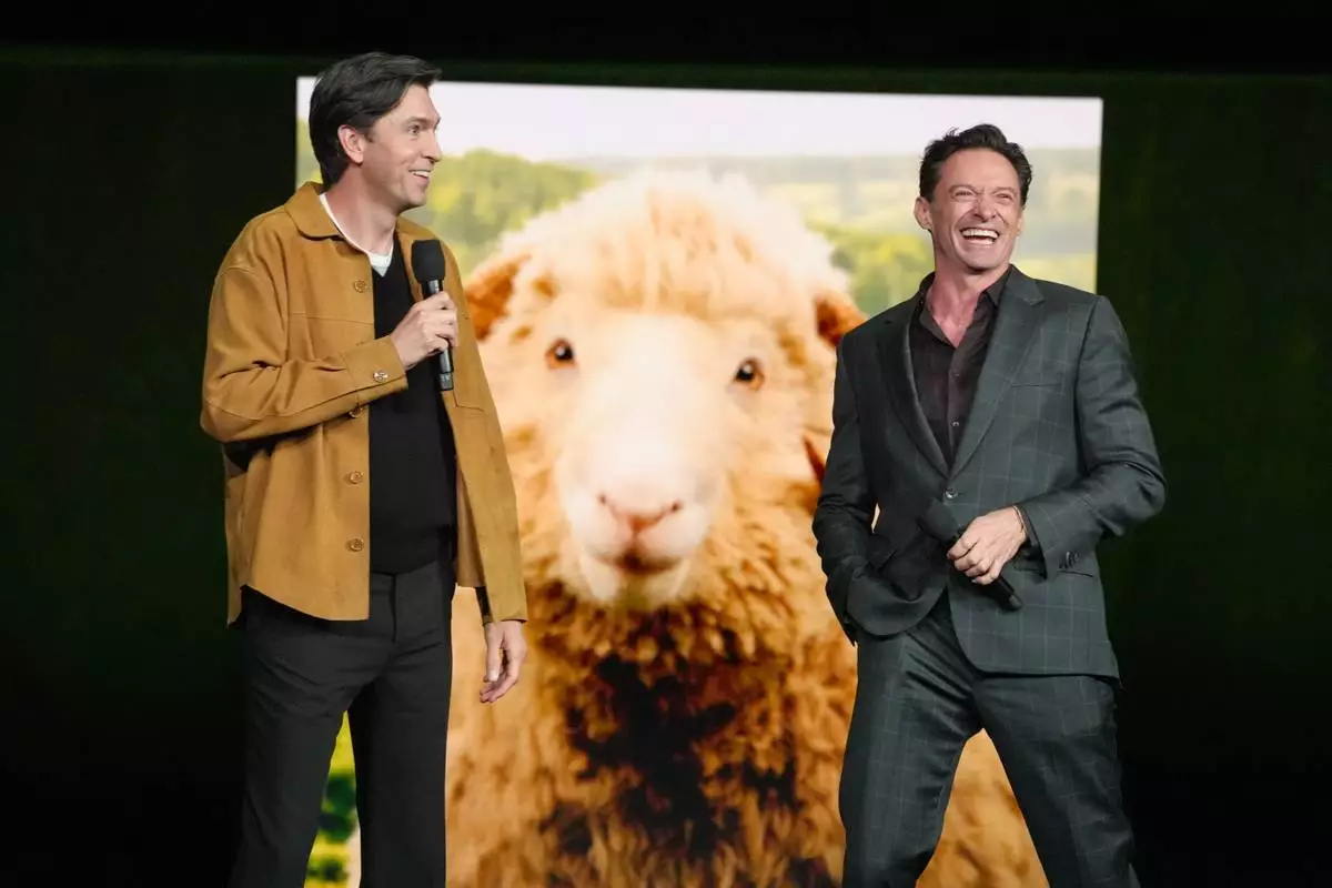 (美聯社圖片/Chris Pizzello) 2026年4月15日周三,電影《羊偵探》演員尼古拉斯布朗(左)及曉治積曼在拉斯維加斯凱撒宮舉行的亞馬遜米高梅影業電影產業大會發布會上發言。 AP圖片