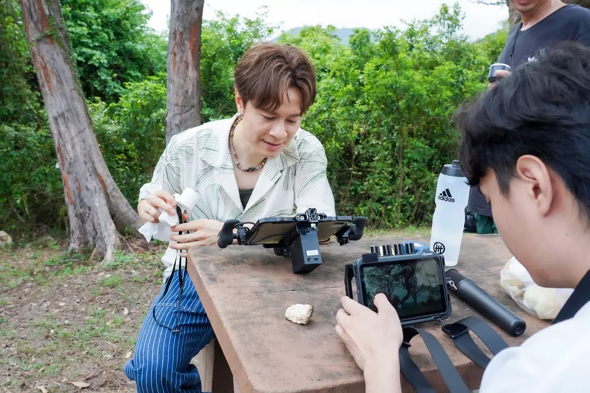 「今日攝影師最辛苦,企高踎低又旋轉,每拍一次要休息10分鐘,因為條腰好攰,手和膊頭都好似做完GYM咁。」趁攝影師休息,安仔不放過任何唱歌的機會,「好聲」喇叭和咪高峰在手,立即化身「西貢beat boxer」,又吹口哨又唱歌。