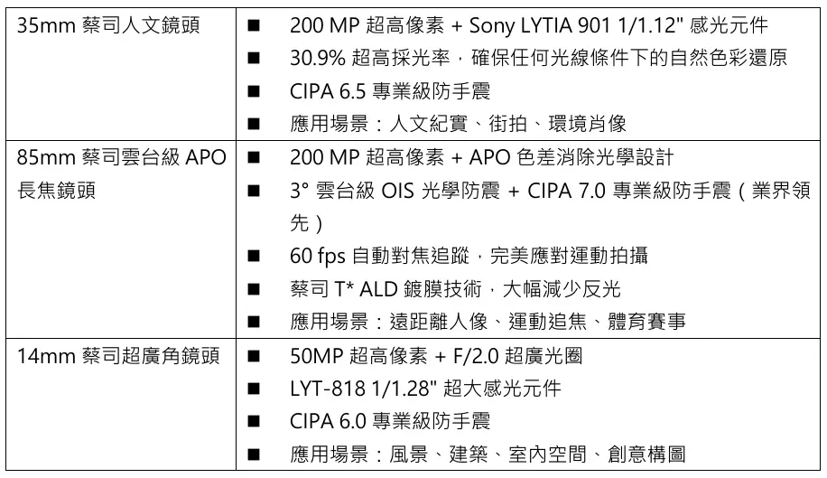 vivo X300 Ultra 為全球首部採用蔡司認證的雙 2 億像素鏡頭的手機,而蔡司主攝鏡頭中涵蓋的三個黃金焦段: 14 mm 超廣角鏡頭以出色的進光量捕捉廣闊場景,而 35 mm 與 85 mm 鏡頭則提供 2 億像素的超高清晰度,完美駕馭從人文紀實到電影級特寫的各種拍攝需求,為專業創作奠下堅實基礎。