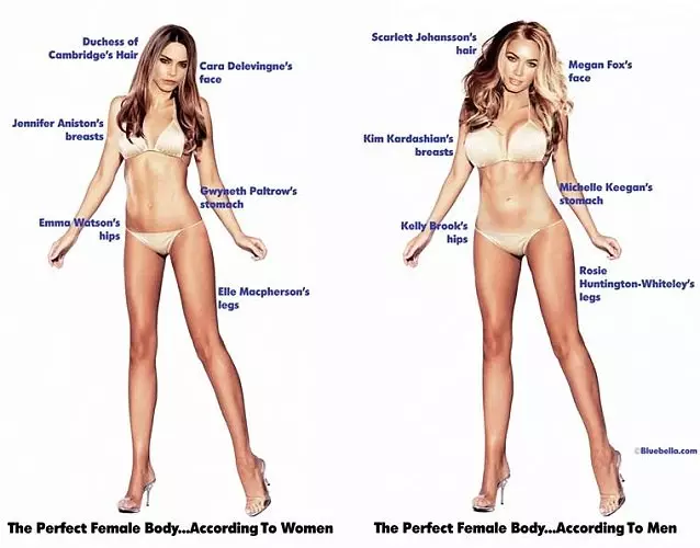 問一個男人什麼是完美女性的身體?他可能提到金卡戴珊(Kim Kardashian)的胸部、英國性感女模Kelly Brook的臀部;但問一個女人同樣的問題,她很可能想到的是珍妮花安妮絲頓(Jennifer Aniston)的胸部、愛瑪沃森(Emma Watson)的臀部,也就是女人夢想中的身材。