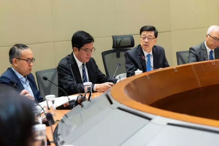 李家超(右二)主持特別會議,聽取跨部門監察燃油供應專責組匯報國際油價波動情況。旁為黃偉綸(左二)、財經事務及庫務局局長許正宇(左一)、環境及生態局局長謝展寰。00