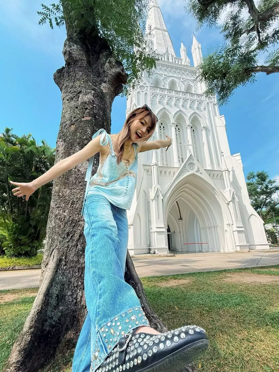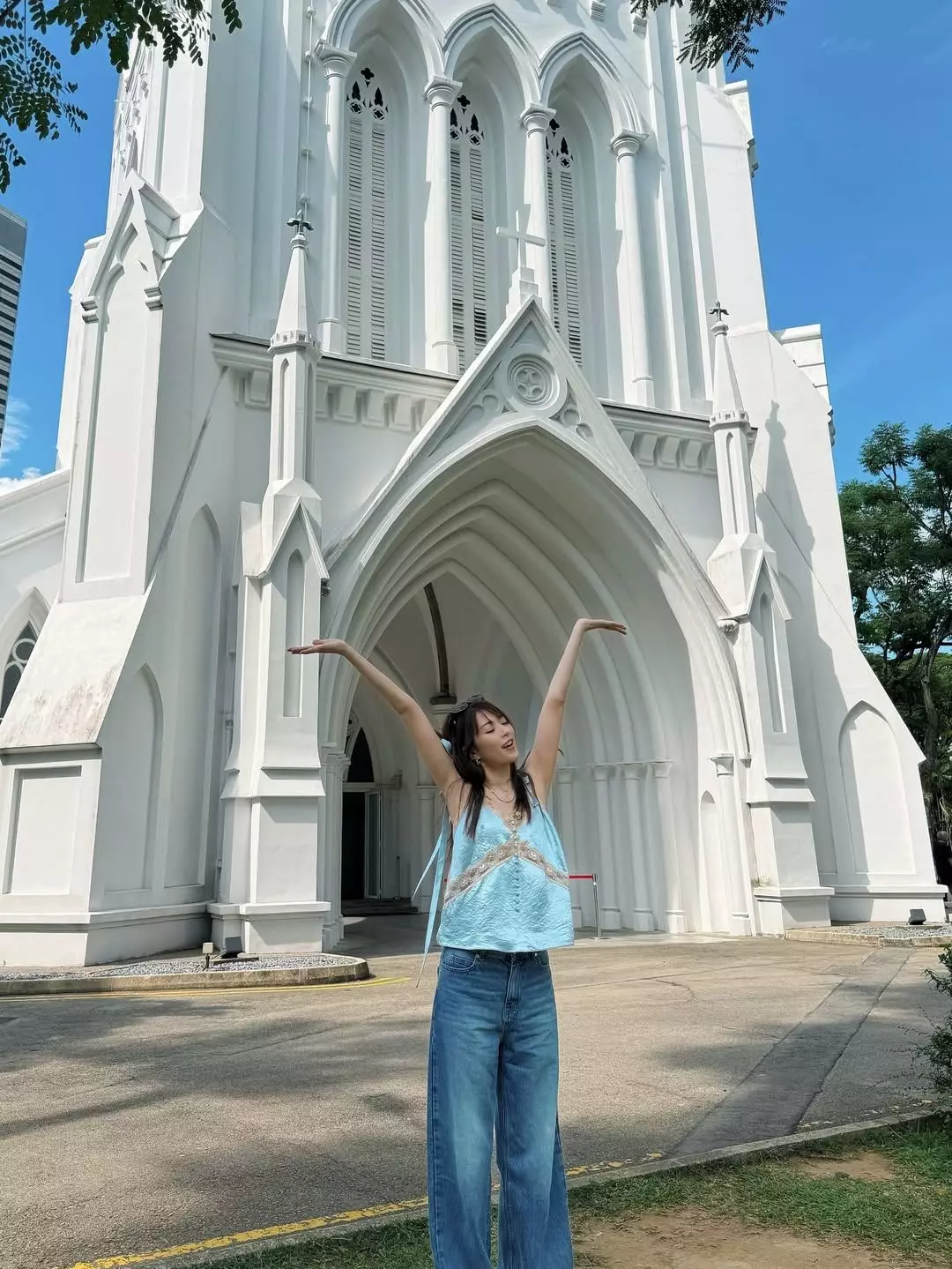 Shiga在IG哂出打卡照,開心道:「感覺係有啲似放假嘅,喂!但係我真係嚟工作㗎!(寓)工作於娛樂係開心嘅#提早感受炎炎嘅夏天#吸收下維他命D」。相中她身穿淺藍色背心配牛仔褲在教堂前Chill爆打卡,還特意低抄凸拍攝大騷長腿。
