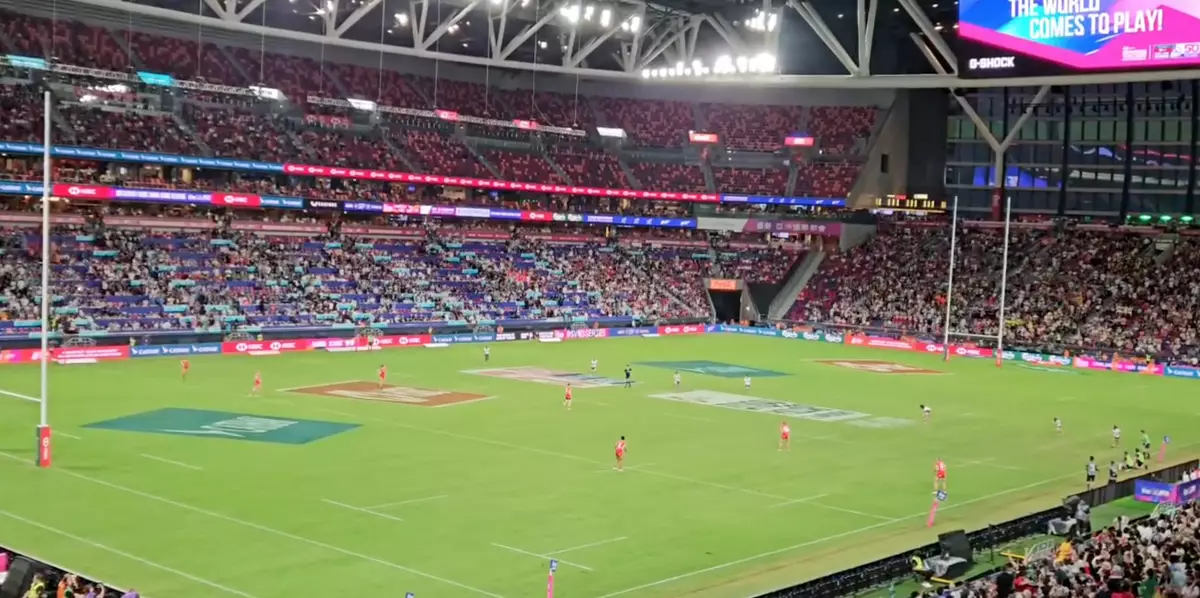 啟德體育園主場館,在大雨下舉行香港國七人欖球賽,賽事期間主場館關閉天幕,但懷疑因為天雨一度漏水,有球迷褲子濕透,有人則撐傘觀戰,園方則指,事件不影響賽事進行。