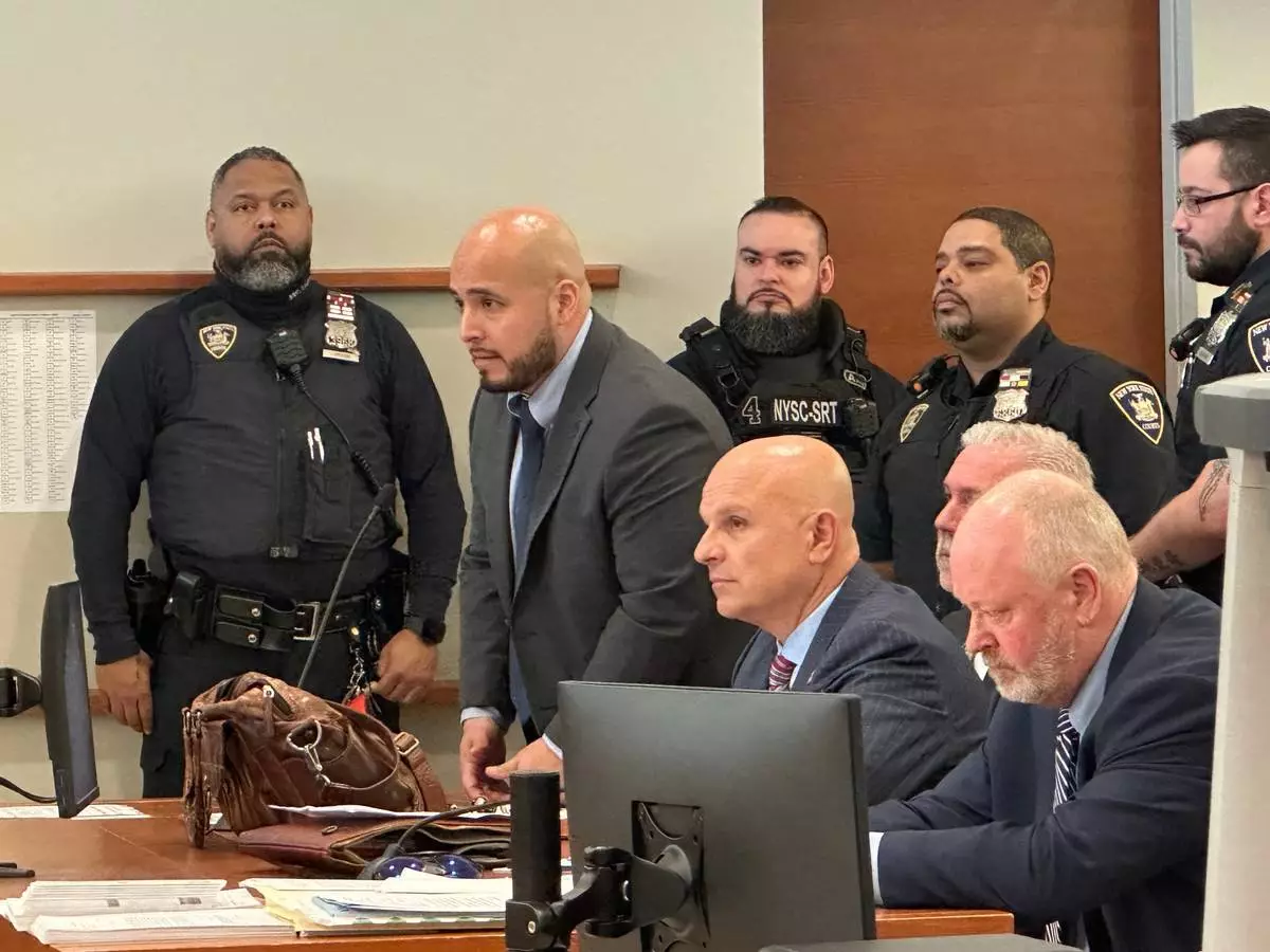 前紐約市警警長杜蘭(Erik Duran)於2026年4月9日周四在紐約布朗克斯縣司法大樓出席判刑聆訊,他被控向逃跑疑犯杜普雷(Eric Duprey)投擲裝滿飲品的野餐冰桶,導致杜普雷電動滑板車失事死亡。(美聯社圖片/Michael R. Sisak) AP圖片
