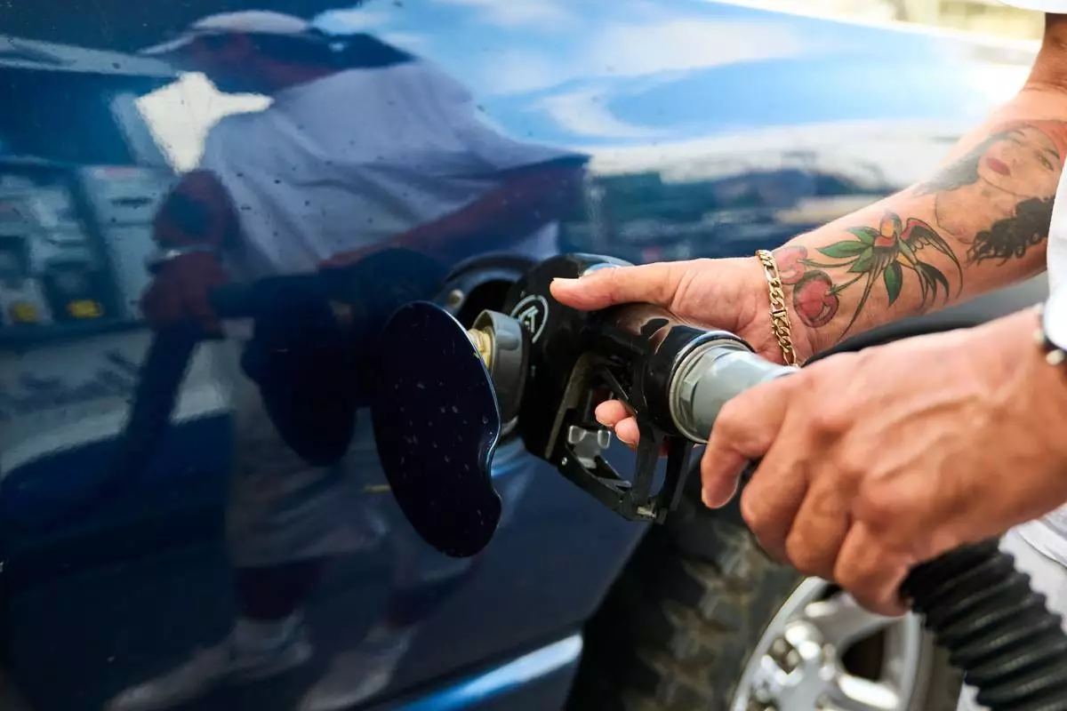 2026年4月17日周五,尼爾馬利克(Neer Malik)在洛杉磯一間油站為其電單車加注一加侖汽油,以行駛約160公里。(美聯社圖片/Damian Dovarganes) AP圖片