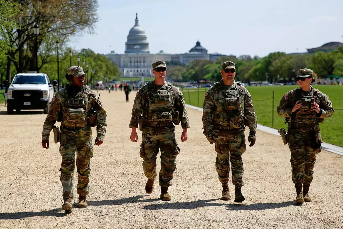 檔案圖片:2026年4月7日,國民警衛軍在華盛頓國家廣場巡邏,背景是美國國會大廈。(美聯社圖片/Rahmat Gul) AP圖片