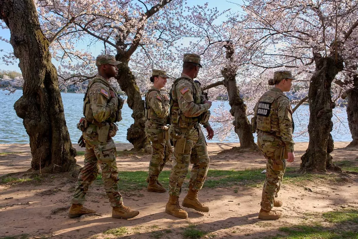 檔案圖片:2026年3月24日,密西西比國民警衛軍(Mississippi National Guard)成員在華盛頓潮汐湖畔的櫻花樹間巡邏。(美聯社圖片/Jacquelyn Martin) AP圖片