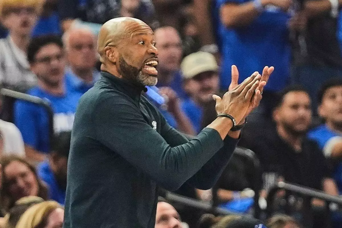 奧蘭多魔術主帥占馬爾莫斯利在2026年4月17日周五於佛羅里達州奧蘭多舉行的一場NBA附加賽籃球賽上半場,向球員們呼喊。(美聯社圖片/John Raoux) AP圖片