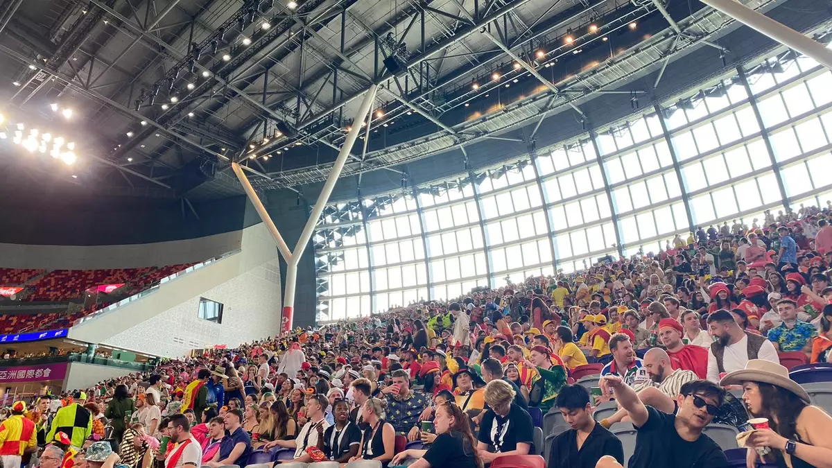 七人欖球盛事踏入第二日,不少球迷一早盛裝打扮,以精心造型浩浩蕩蕩前往啟德體育園,體育園方表示,目前南看台內人數達到上限,一般門票觀眾需於B閘外指定等候區排隊,待有人離場後,按現場工作人員指示依序入場。 此外,二樓觀賽區人流亦較為集中,呼籲觀眾請前往五樓觀賽區繼續欣賞賽事。
