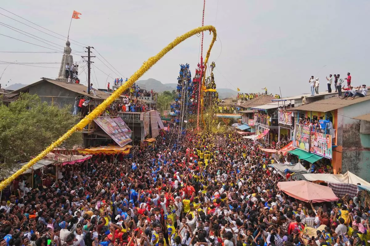2026年4月17日周五,距離印度孟買約61公里的拉維村,阿格里-科利社區成員競逐豎立名為德夫卡蒂(Devkathi)的儀式竹竿,這是紀念當地萊巴黛維女神的數百年年度傳統活動之一。(美聯社圖片/拉菲克·馬克布爾) AP圖片