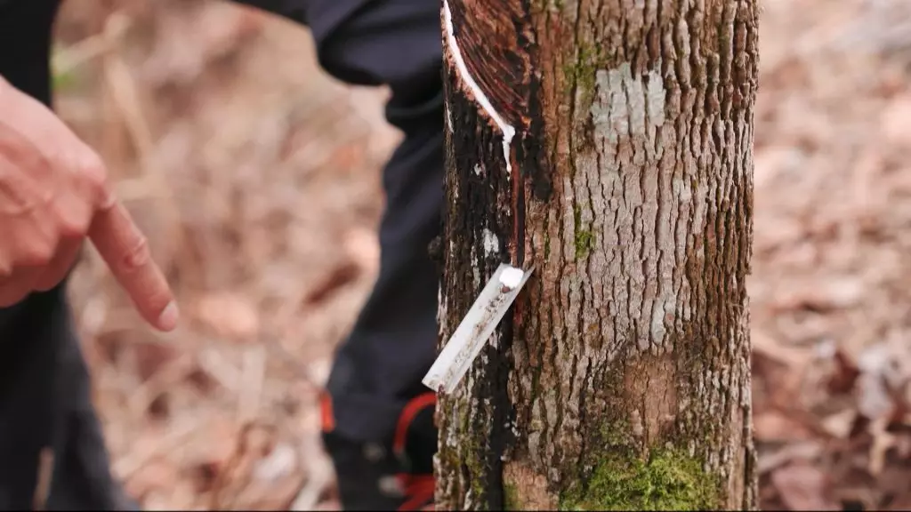 二人隨即出發體驗採樹膠,成功開採後有白色液體流出。