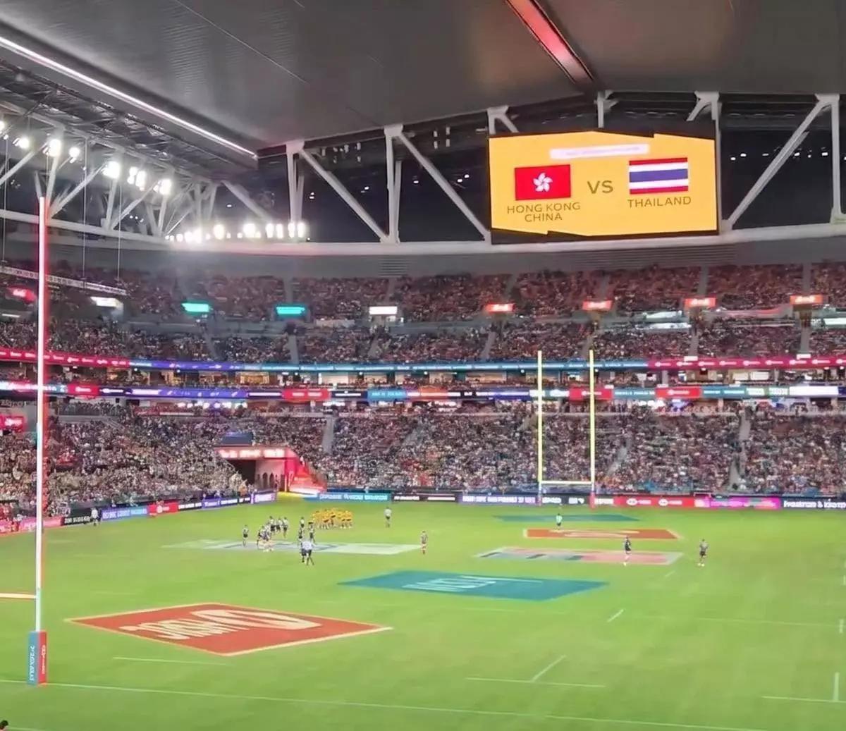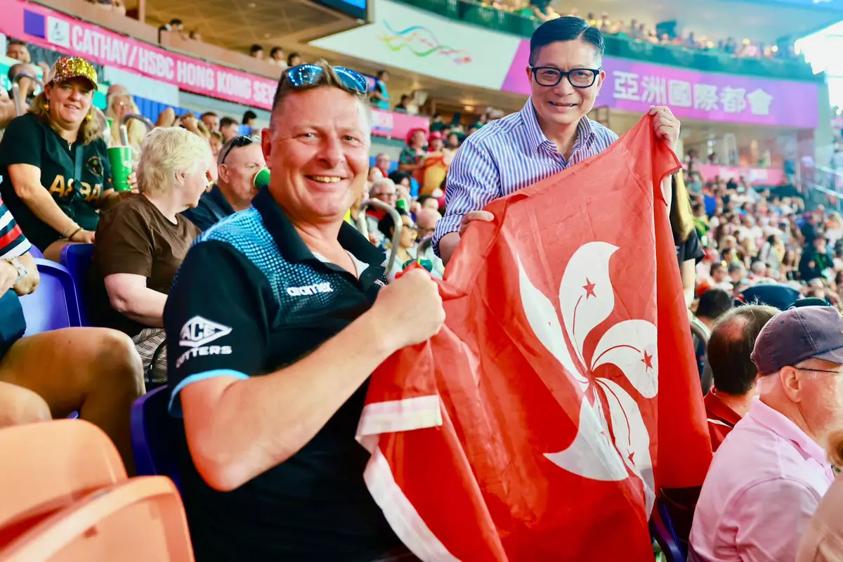 香港國際七人欖球賽第二日賽事,保安局局長鄧炳強到場視察人流管理和維持秩序的情況,並走入南看台與球迷交流和合照。