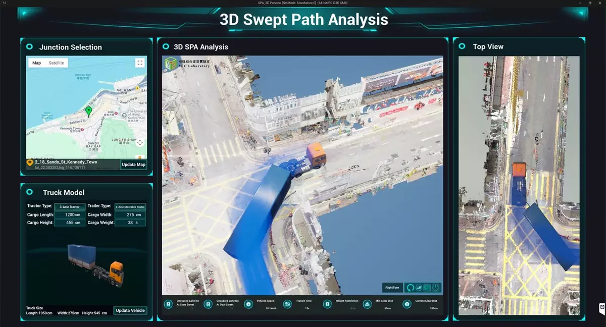 此項目核心在於利用三維點雲和模擬技術,精確重建及分析拖車在運送大型建築結構組件時,於複雜路口、迴旋處和窄路等實際通行情境。透過模擬,可預先評估並減低運輸過程中的安全風險。