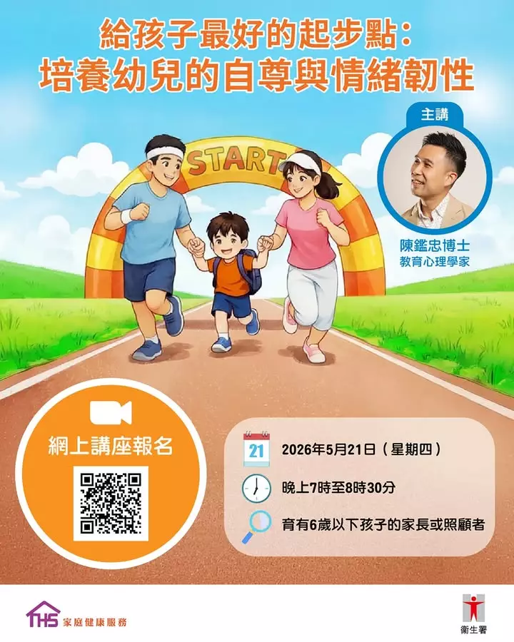教育心理學家陳鑑忠博士將於網上講座,與家長一同探討「贏在起跑線」的迷思,並分享如何在競爭激烈的成長環境中,關顧兒童的自尊感及情緒健康。講座歡迎育有6歲以下孩子的家長或照顧者參加。