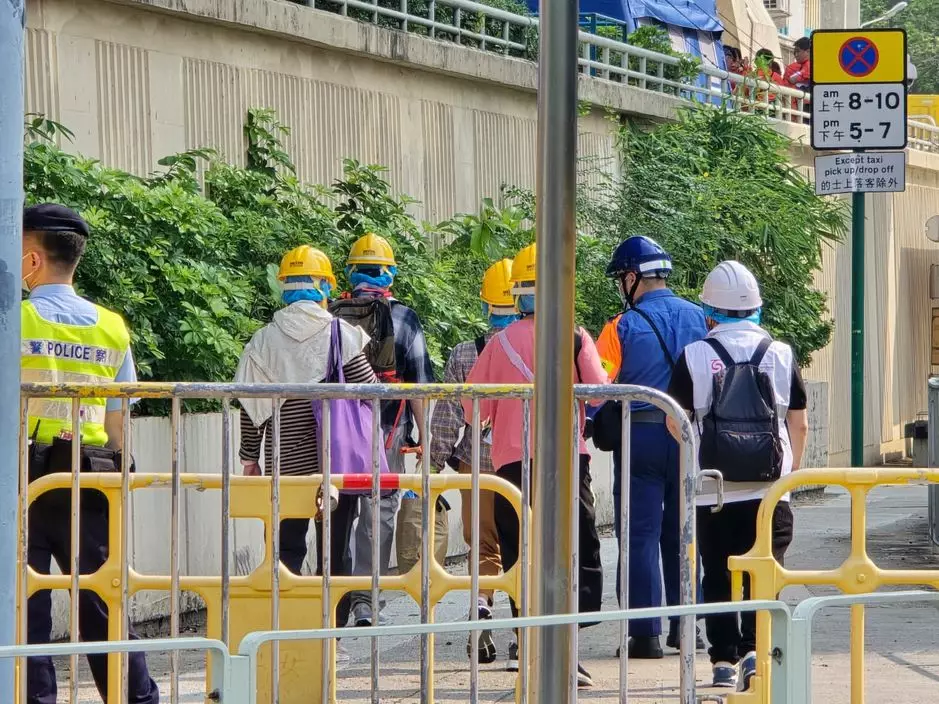 上樓居民都配備頭盔、口罩、手套等安全裝備,並由警務人員或民安隊隊員陪同上落樓及進出單位。巴士的報記者攝