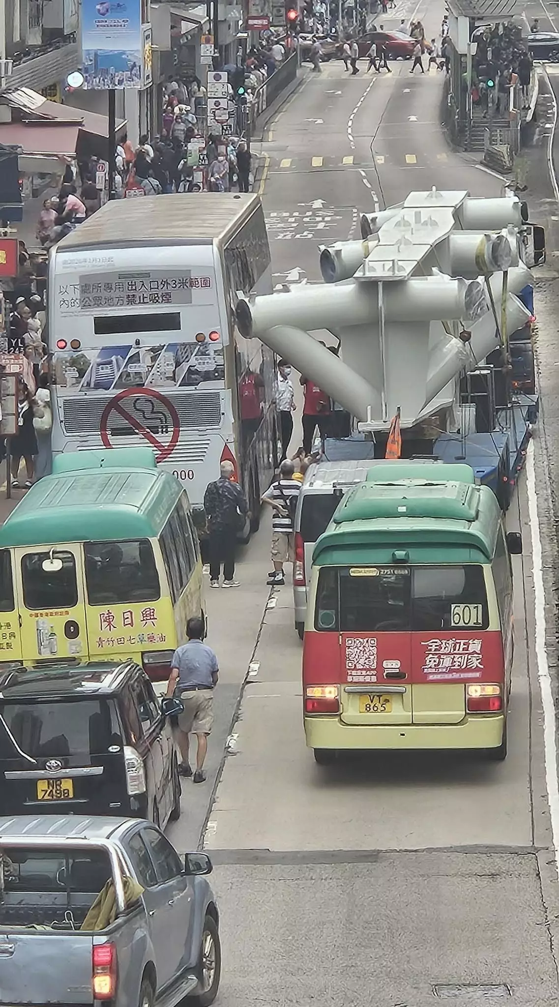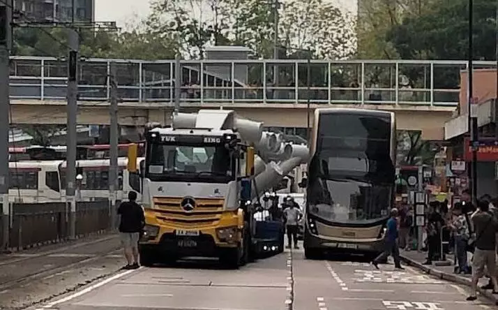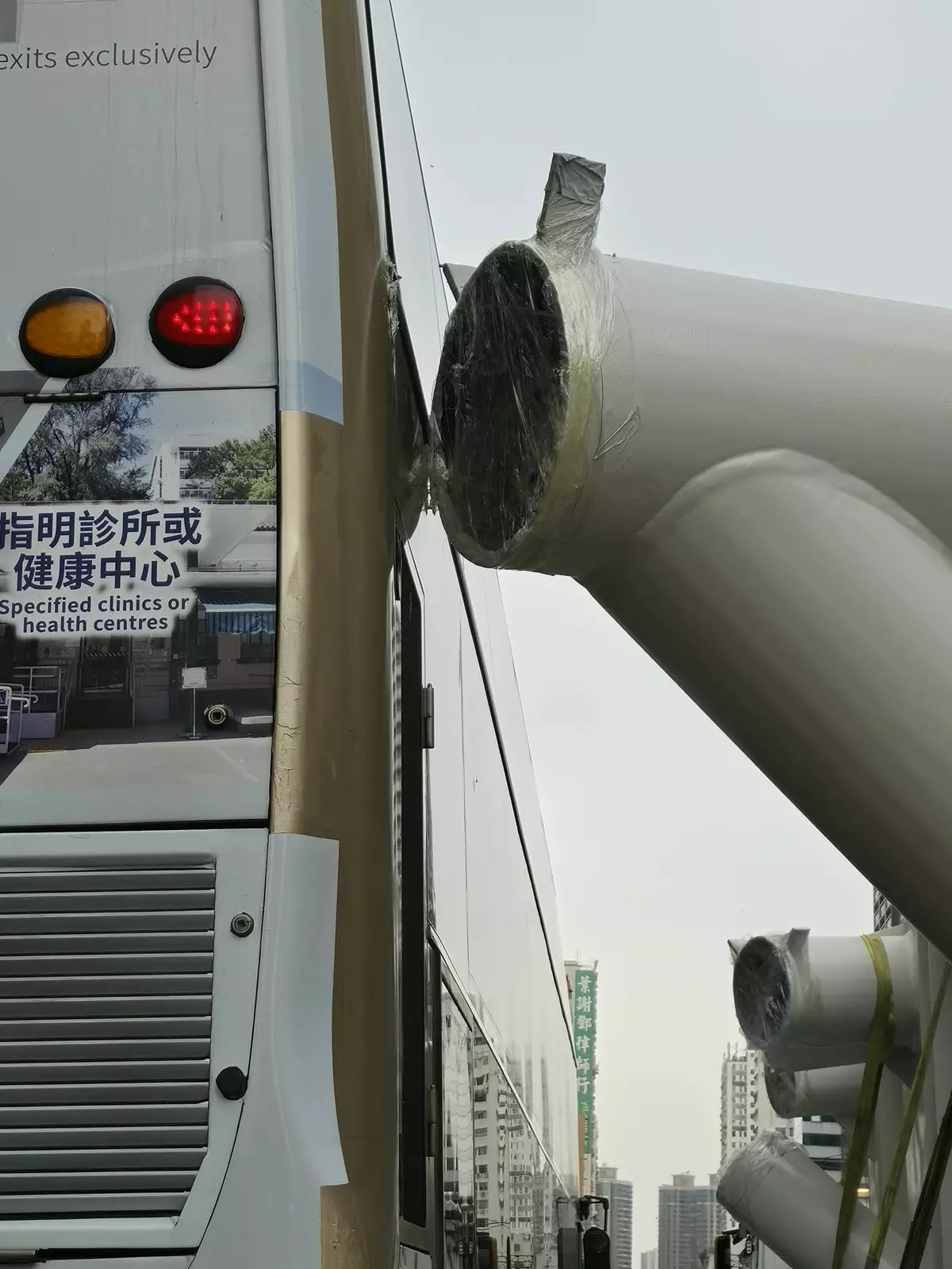 一輛九巴沿元朗大馬路(青山公路-元朗段)往屯門方向行駛,駛至中銀香港一分行對開時,巴士右車身與一輛拖頭載運的巨型工程組件伸出的鐵管發生擦撞。