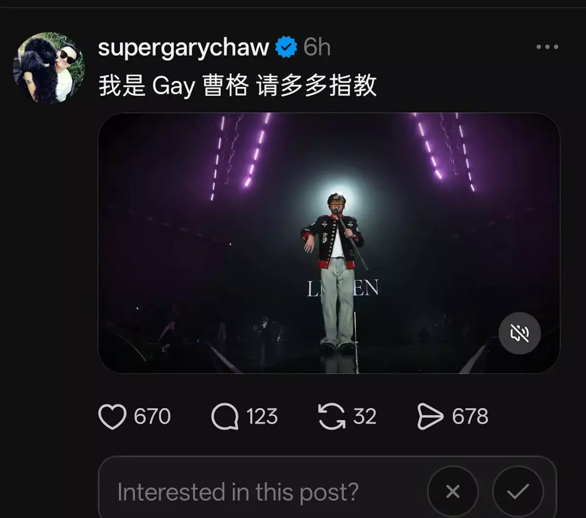 曹格疑因打字失誤,竟將英文名「Gary」誤打成「gay」,令整句自我介紹瞬間變成自爆「我是gay曹格」。貼文一出,旋即在網上掀起熱烈討論,網友紛紛震驚留言。發現錯誤後,曹格火速刪除貼文,並重新發布了正確版本。