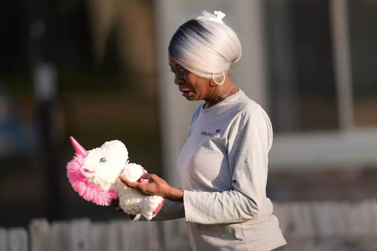 一名女子抵達路易斯安那州什里夫波特(Shreveport)大規模槍擊案現場時,手持一隻獨角獸毛絨玩具。攝於2026年4月19日周日。(美聯社圖片/Gerald Herbert) AP圖片