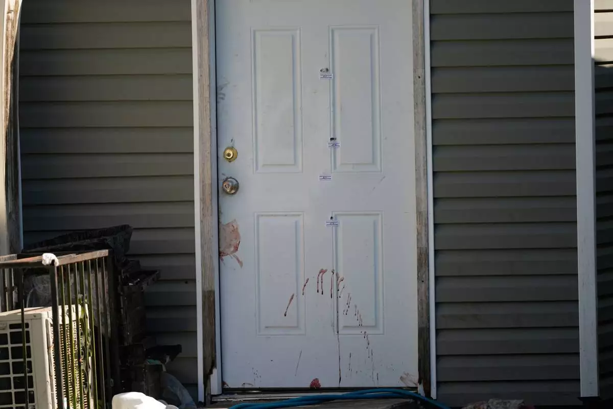 一扇看似沾有血跡並貼有證物標記的門,在路易斯安那州什里夫波特(Shreveport)大規模槍擊案現場外關閉。攝於2026年4月19日周日。(美聯社圖片/Gerald Herbert) AP圖片