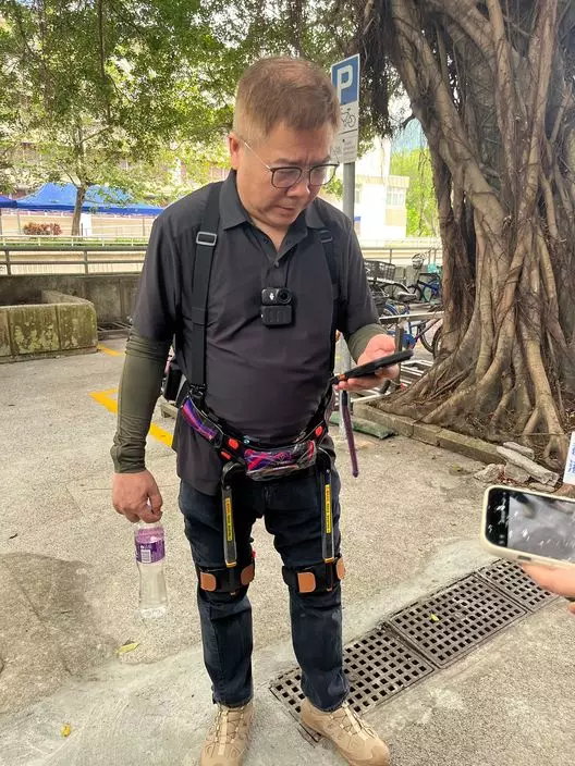 一身裝備前來執拾物品的宏新閣居民譚先生表示,由於住在17樓,擔心上樓會耗費體力,因此花了數千元購買了一套據稱能減輕行走時負擔的輔助裝備「外骨胳」。他曾試過從十幾樓走上三十幾樓,認為「力氣大概省了一半,但喘氣與體力消耗則無法改變」。