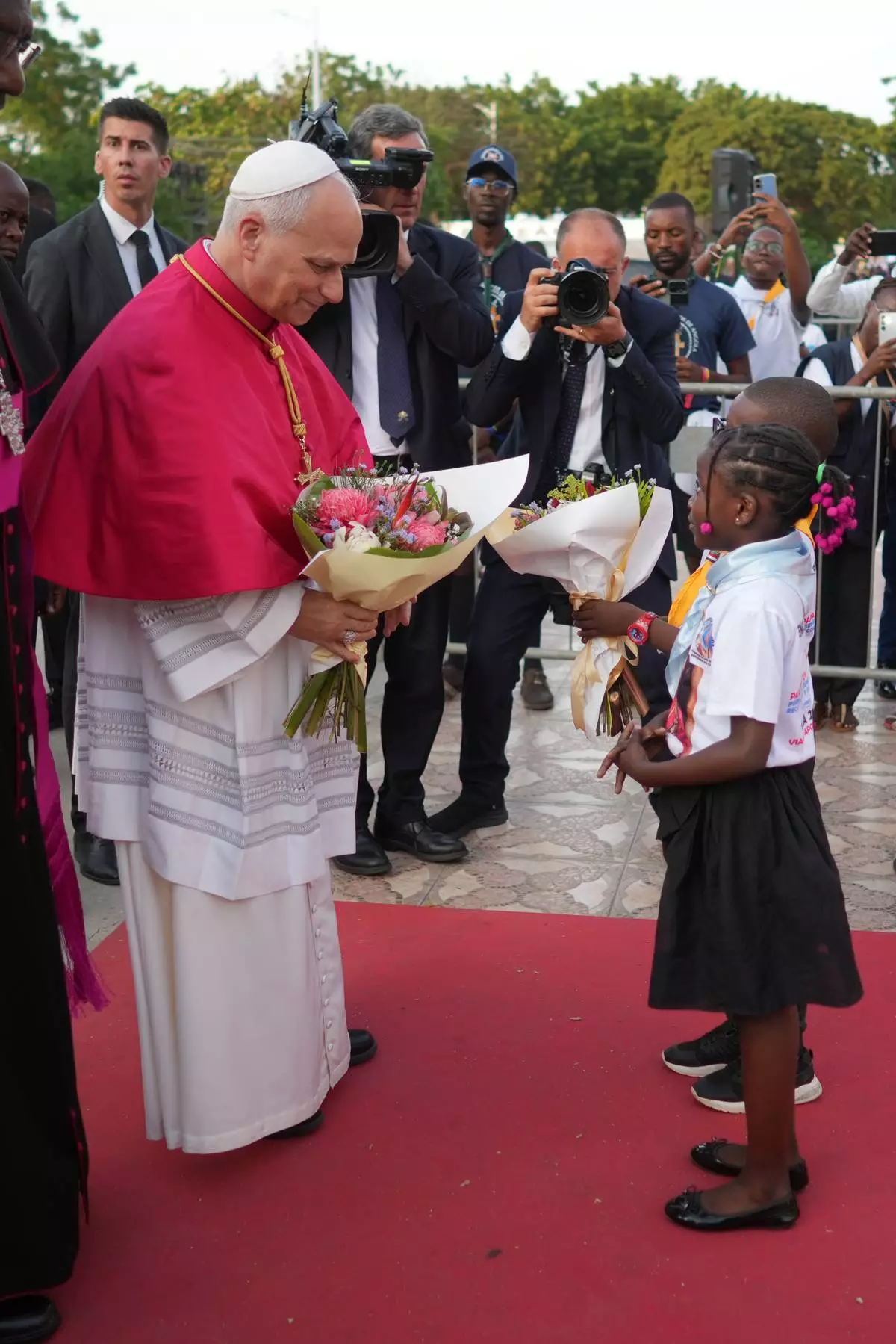 教宗良十四世在總統府站在保羅比亞身旁發表抵達演說時,毫不保留地指出:「為了讓和平與正義得以伸張,必須打破貪腐的枷鎖,這些枷鎖扭曲了權威,剝奪了其公信力。人心必須從對利益的偶像崇拜中解放出來。」