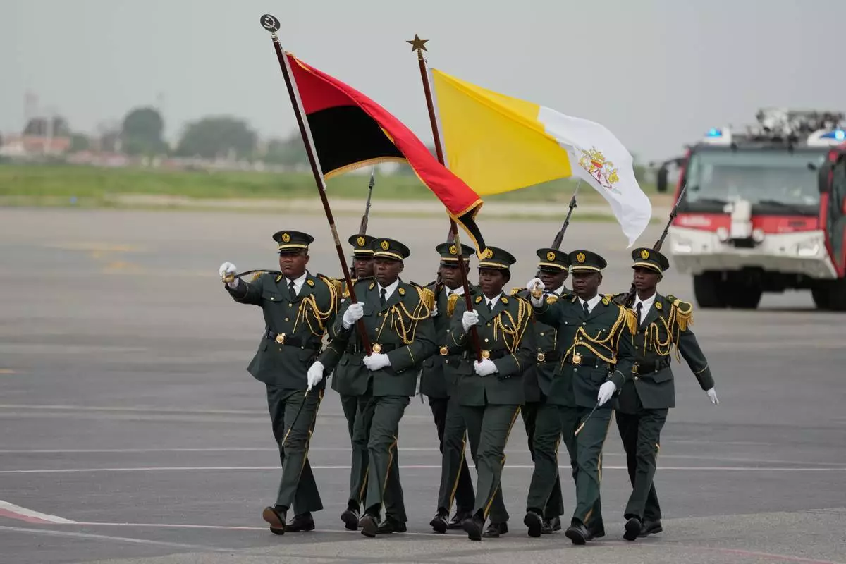 2026年4月21日周二,安哥拉羅安達機場,教宗利奧十四世啟程前往赤道畿內亞前,士兵們手持梵蒂岡國旗(右)和安哥拉國旗步操。(美聯社圖片/Themba Hadebe) AP圖片