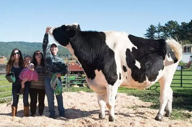 這頭「神高神大」的牛牛叫丹尼爾,牠食量驚人,每日除了吃100磅的乾草外,還要吃15磅的穀物,再飲100加侖的水。由於吃得多,拉屎也多,每日排出150磅糞便。