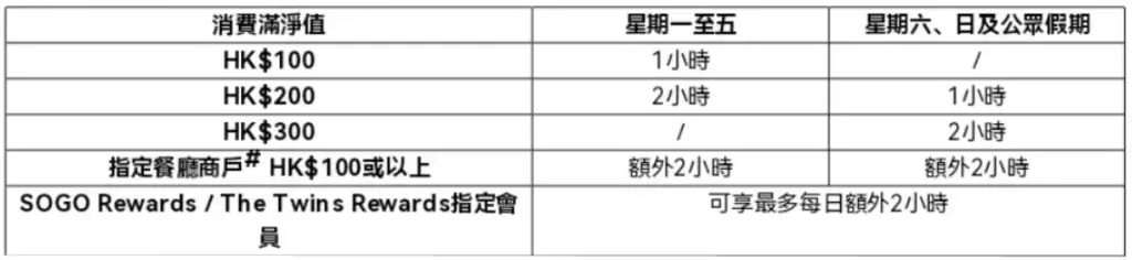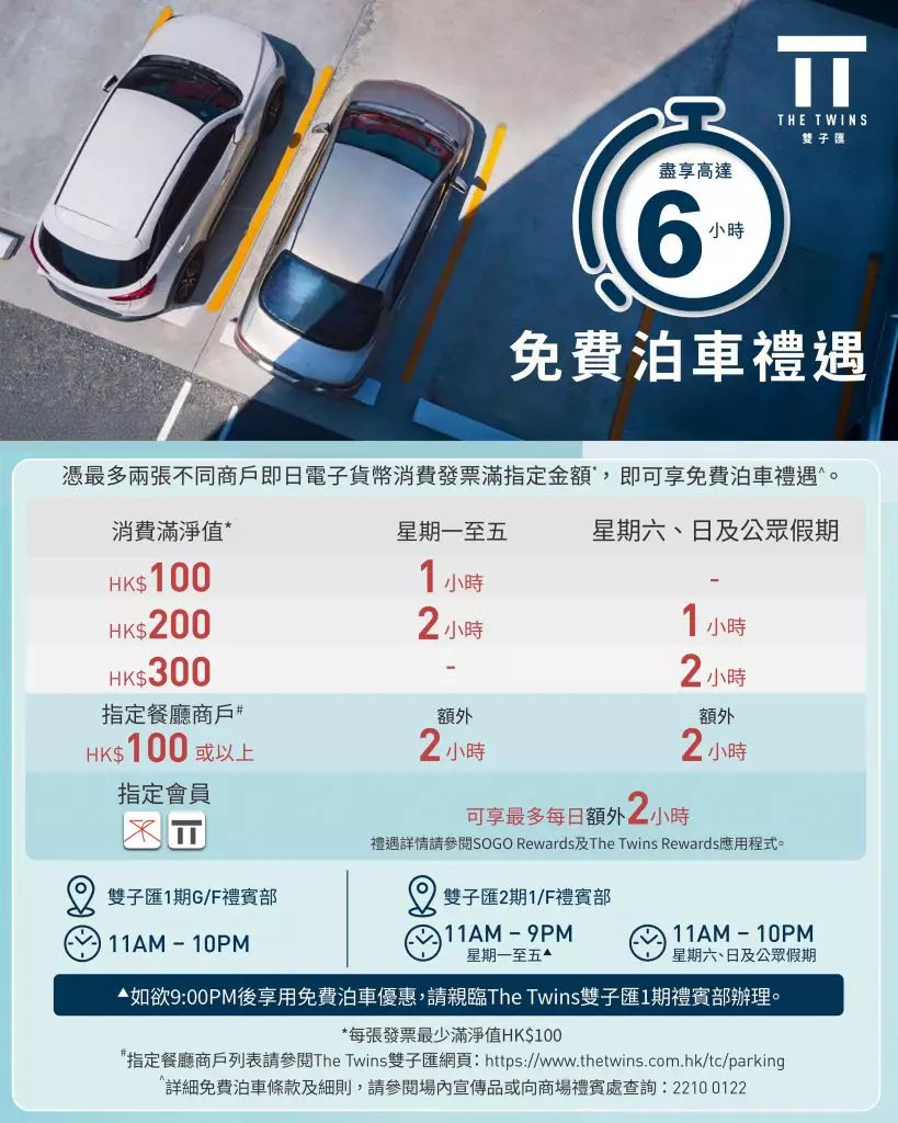 由即日起,雙子匯1期及2期顧客,憑最多兩張不同商戶即日電子貨幣消費發票滿以下指定金額(每張最少滿淨值HK$100),即可享免費泊車禮遇;惠顧指定餐廳商戶或成為SOGO Rewards/The Twins Rewards會員,更賞額外時長,最高總共可達6小時,讓您與親朋好友無拘無束地享受崇光感謝周年慶的食買玩快樂時光!