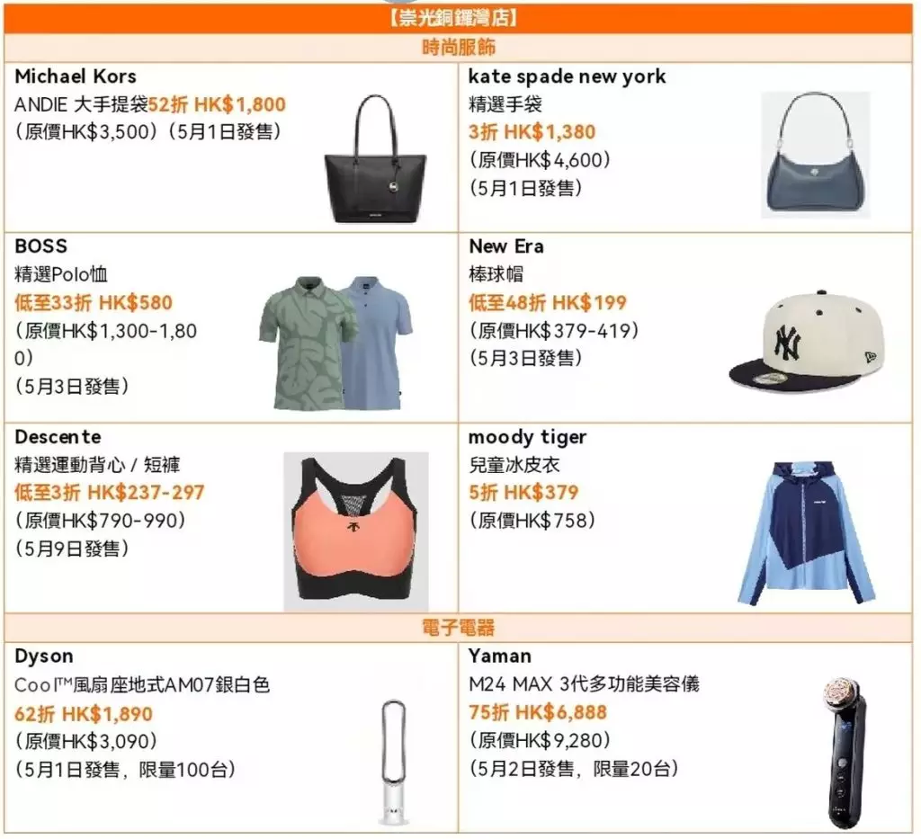 崇光感謝周年慶是港人心目中最炙手可熱的購物嘉年華,每年開幕均引起全城追捧!今年崇光40+1周年慶Part 1驚喜優惠更上一層樓,由國際精品、時尚服飾、美容護膚,到電子電器、生活家品、運動塑身、寵物育兒等,應有盡有,目不暇給,全面升級您的品味生活。當中銅鑼灣店焦點商品必搶3折kate spade new york精選手袋、29折BOSS精選Polo恤、62折Dyson Cool™座地式風扇等,而啟德店則以LEVI’S HK$899兩條牛仔褲、低至11折Mouri日本Akoya珍珠純銀首飾、38折Sealy床褥、21折Cherry瑞士羽絨被等打破低價想像,為生活增添超凡喜悅。