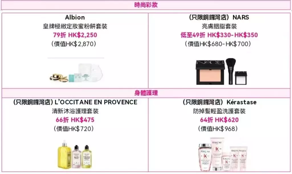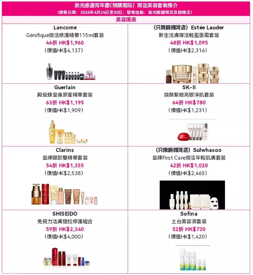 矚目優惠包括46折「Lancome Génifique煥活修護精華115ml套裝」(優惠價HK$1,960/原價HK$4,137)、48折「Estée Lauder新生活膚彈活輕盈面霜套裝」(優惠價HK$1,095/原價HK$2,316)、54折「Clarins皇牌眼部雙精華套裝」(優惠價HK$1,355/原價HK$2,538)、64折「SK-II煥顏緊緻亮眼淨肌套裝」(優惠價HK$780/原價HK$1,231)、42折「Sulwhasoo皇牌First Care煥活年輕肌膚套裝」(優惠價HK$1,020/原價HK$2,465)等,崇光為您春夏煥膚增添無窮力量。