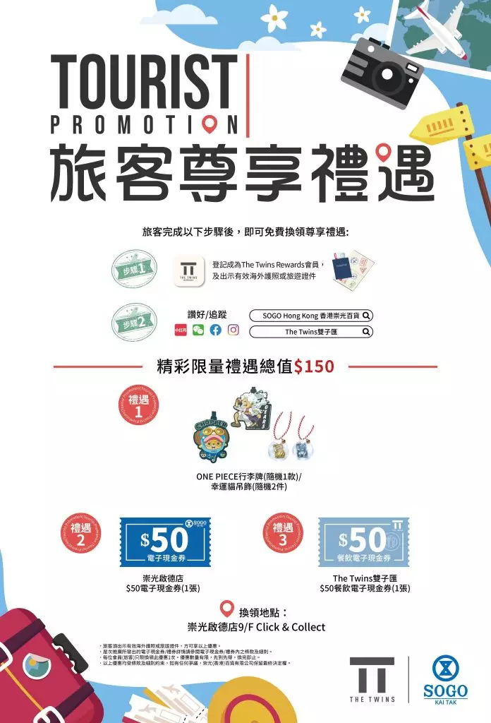 由即日起至12月31日,旅客於雙子匯1期只需登記成為The Twins Rewards會員,讚好或追蹤SOGO Hong Kong香港崇光百貨或The Twins雙子匯任何一個社交媒體帳號(小紅書/WeChat/Facebook/Instagram),並出示有效海外護照或旅遊證件,即可免費獲贈總值HK$150的3大禮遇,當中包括ONE PIECE行李牌或幸運貓吊飾、崇光啟德店HK$50電子現金券1張及The Twins雙子匯HK$50餐飲電子現金券1張,讓旅程更精彩。