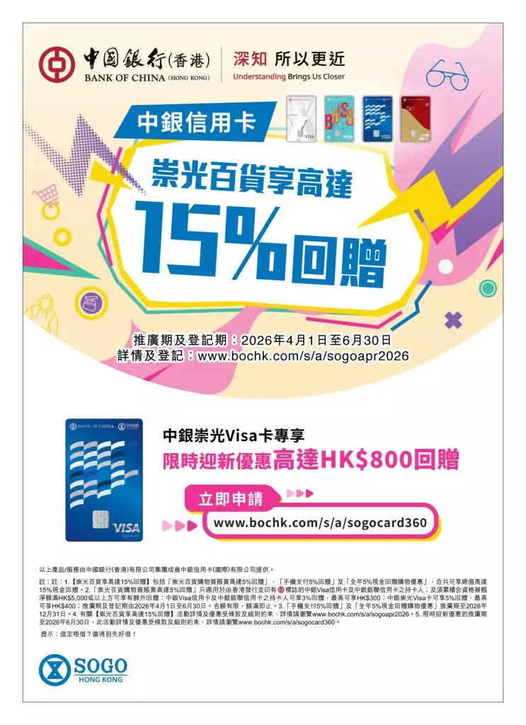 由即日起至6月30日,中銀信用卡用戶於崇光百貨累積合資格簽賬淨額滿HK$5,000或以上,可享高達15%回贈,詳情及登記請到網頁www.bochk.com/s/a/sogoapr2026;與此同時,中銀崇光Visa卡專享限時迎新優惠高達HK$800回贈,詳情及申請請到指定網頁www.bochk.com/s/a/sogocard360,把握機會讓崇光感謝周年慶的購物消費體驗抵上加抵。