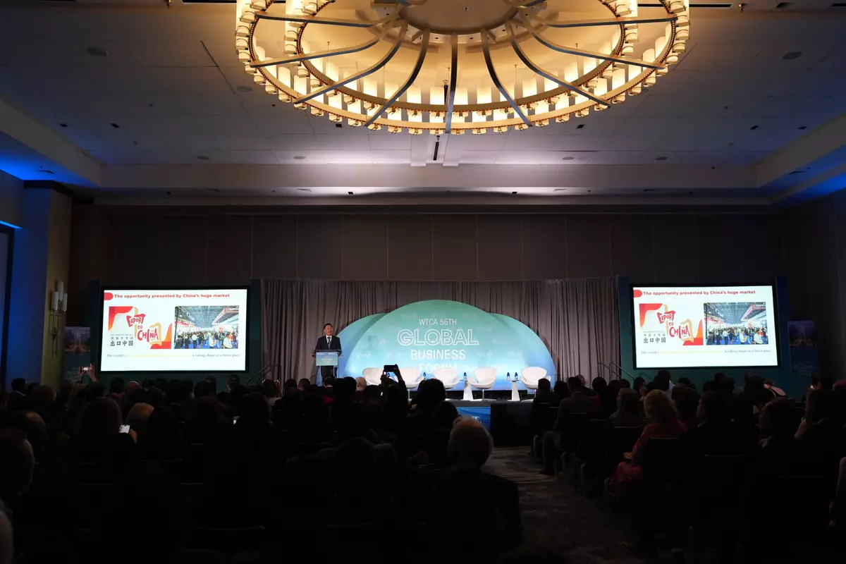 謝鋒在費城舉行的世界貿易中心協會全球商業論壇開幕式發表主旨演講。中國駐美國大使館網頁圖片