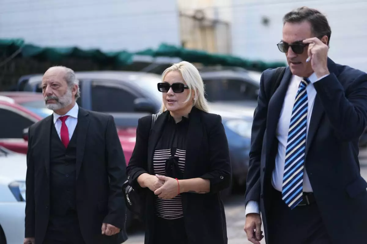 已故足球巨星馬拉度納(Diego Maradona)的前伴侶奧赫達(Veronica Ojeda,中)周二(2026年4月14日)抵達阿根廷聖伊西德羅(San Isidro)法院,出席其醫療團隊涉嫌疏忽致死罪審訊的首日聆訊。(美聯社圖片/Rodrigo Abd) AP圖片