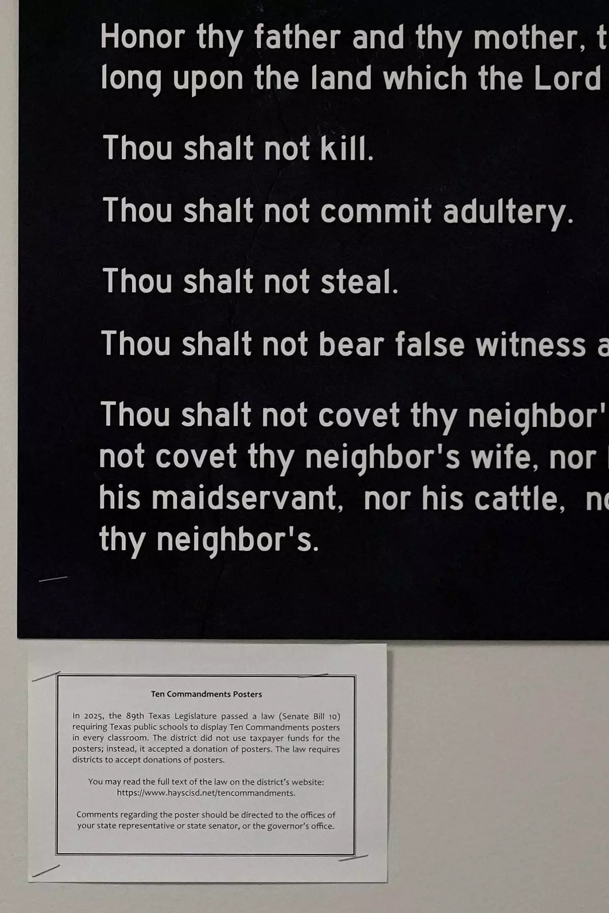 (美聯社圖片/Eric Gay) 檔案圖片:2025年10月16日周四,德州凱爾(Kyle, Texas)利曼高中(Lehman High School)的一間課室內,展示着《十誡》海報及州新法例的解釋。 AP圖片