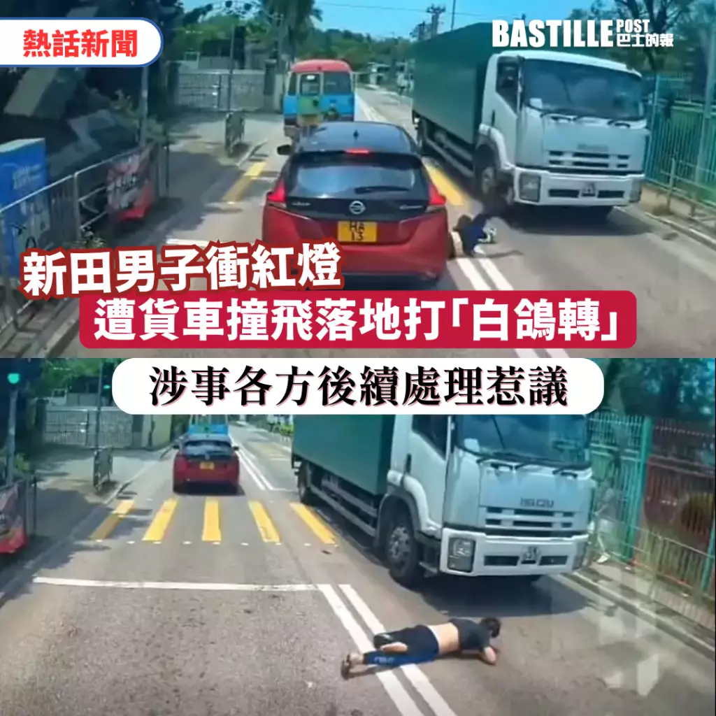 網上流傳一段車CAM片段,揭露新田發生一宗驚險交通意外。一名男子疑衝紅燈橫過馬路時,遭駛至貨車撞飛,更反彈撞向鄰線私家車,落地後痛苦「打白鴿轉」,險象環生。